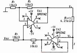 由于溫度對集成運放參數影響不如對晶體管或場效應管參數影響顯著,由集成運放構成的恒流源具有穩定性更好、恒流性能更高的優點。尤其在負載一端需要接地的場合,獲得了廣泛應用。所以采用圖2所示的雙運放恒流源。其中放大器UA1構成加法器,UA2構成跟隨器,UA1、UA2均選用低噪聲、低失調、高開環增益雙極性運算放大器OP07。